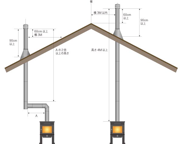 - 煙突から横に3mの距離に屋根面がくる高さを割り出し、そこからさらに60cm以上煙突を高くする。横3m以内に棟がある場合は棟から60cm以上高くする。