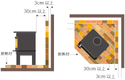ストーブまたは煙突などの熱を放出する近くの可熱性の物品には断熱材が必ず必要になります。断熱材を使用せず使っていますと、火災を招く恐れがあります。断熱材は必ずしましょう。